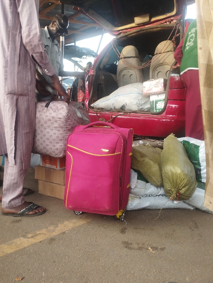 The scene is a street corner in Gombe, Nigeria (latitude: 10.315, longitude: 11.143). A man in a long-sleeved, light-colored, striped shirt and pants is loading luggage into the open trunk of a red car. The trunk is filled with bags and other items. The man is placing a pink suitcase on the ground next to the car. There is another person, partially obscured, wearing sunglasses, and a partially obscured person to the left of the car. In the background, a person wearing a green and white shirt is standing near the car. The scene is outside in a paved area, and the car is parked near the edge of a curb.
