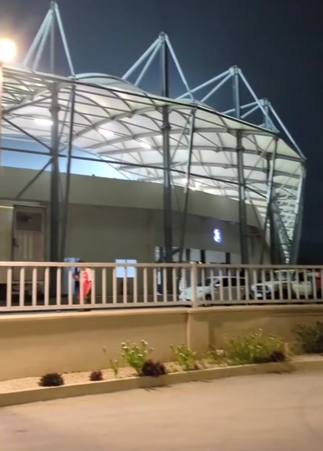 The video depicts the exterior of a stadium at night. The stadium features a white roof structure with triangular supports and white walls. A white fence runs along the base of the structure, with small plants and landscaping in front of it. A single streetlight illuminates the area, creating a bright spot against the dark sky. A bus with the "Azam FC" logo on its side passes behind the fence. People are visible in the background near the stadium entrance. The environment is dark, with a clear night sky above. The camera appears to be moving, likely from a vehicle passing by.
