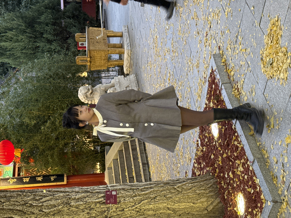 An outdoor scene in Xicheng District, China, depicts a young East Asian female standing on a paved surface extensively covered with fallen yellow ginkgo leaves. The subject, positioned slightly left of center, wears a grey, button-front dress or coat with a light yellow collar and a cream-colored pussy-bow tie, dark tights, and black mid-calf combat boots. Her hands are clasped behind her back, and she gazes towards the right. To her immediate left, a large tree trunk with textured bark rises from a reddish-brown mulched area containing two illuminated circular ground lights. In the background, a traditional Chinese building is visible, featuring a prominent red pillar, a dark vertical sign with gold Chinese characters identified as '宫廷風味' (Gongting Fengwei - Palace Flavor), and a red lantern hanging above. Stone steps ascend towards this structure. Further right in the background, a stone guardian lion statue and a large, ornate golden incense burner with four legs are present on a stone platform, flanked by green bamboo and evergreen trees. A blurry, partial figure, visible from the mid-thigh down, wearing dark pants and grey shoes, is in motion on the far right of the frame.
