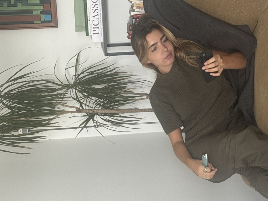 An indoor scene in Unknown, Unknown, shows a female individual reclining on a brown-orange upholstered couch. She has light brown hair and is dressed in a short-sleeved, ribbed olive-green top and olive-green trousers. A dark grey throw blanket is draped over the back of the couch, supporting her head. Her right hand holds a black smartphone, with fingers around the device and thumb positioned over the screen; light pink nail polish and a ring on her right ring finger are visible. Her left hand holds a light blue/green personal electronic device, with a ring also visible on her left ring finger. Behind the couch and to the left, a large potted plant with multiple stems and narrow green leaves is situated next to a dark metal pole featuring a white clip. To the right, a black metal shelving unit contains stacked books, notably a large white book titled "PICASSO." A framed abstract artwork, depicting geometric shapes in green, blue, black, and brown, hangs on the white wall above the bookshelf. The room has plain white walls.