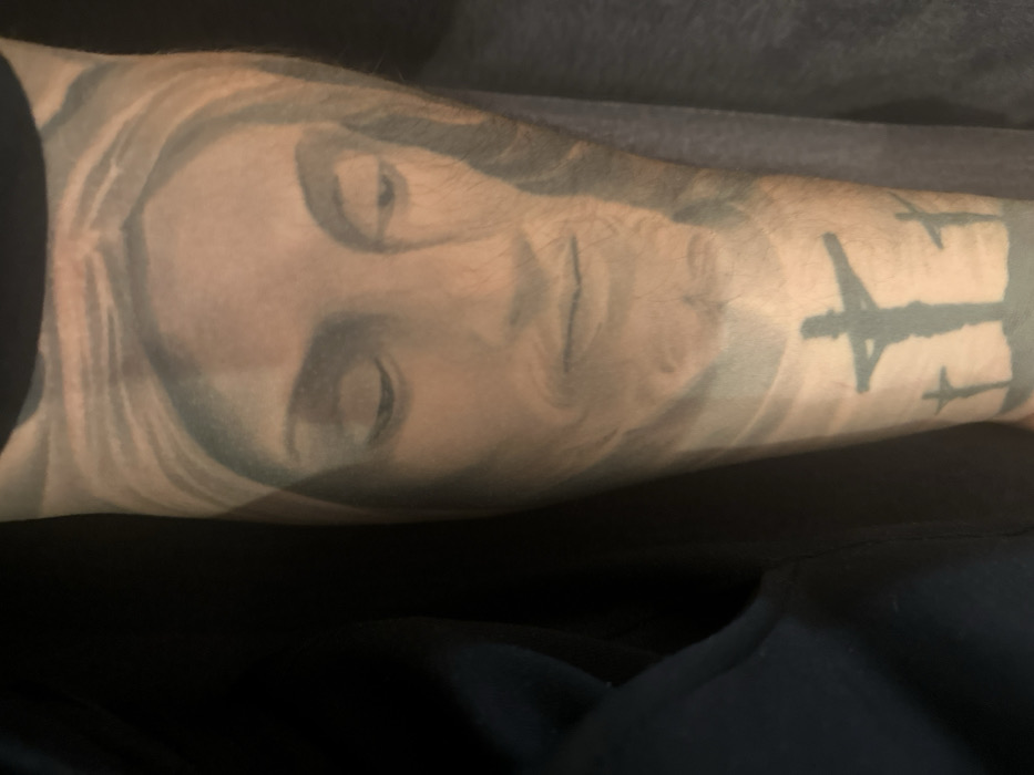 - "The image displays a close-up view of a human arm, specifically the forearm, featuring a black and grey tattoo" by FM-SdasM2, licensed under CC BY 4.0