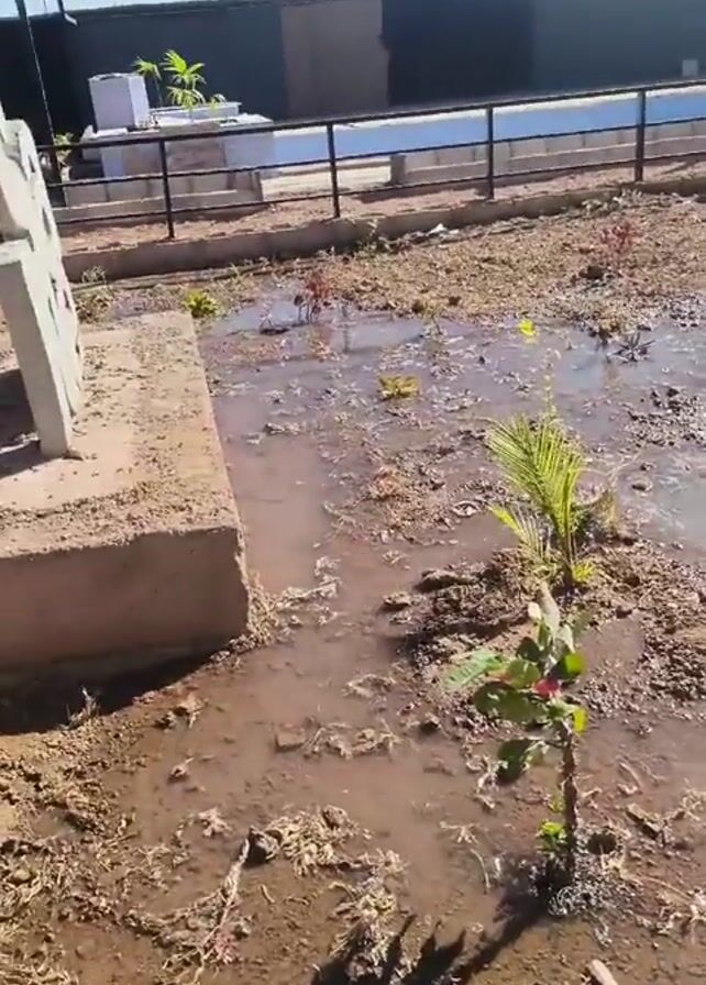 flooded garden plot with small plants, possibly newly planted, standing in shallow pools of muddy water. A length of hose is visible, suggesting recent or ongoing watering. In the background, a fence separates the garden from what appears to be a pool area. There are two people visible in the background, one appearing to walk along the pool fence and the other bending down near some equipment. The sky is clear and blue.