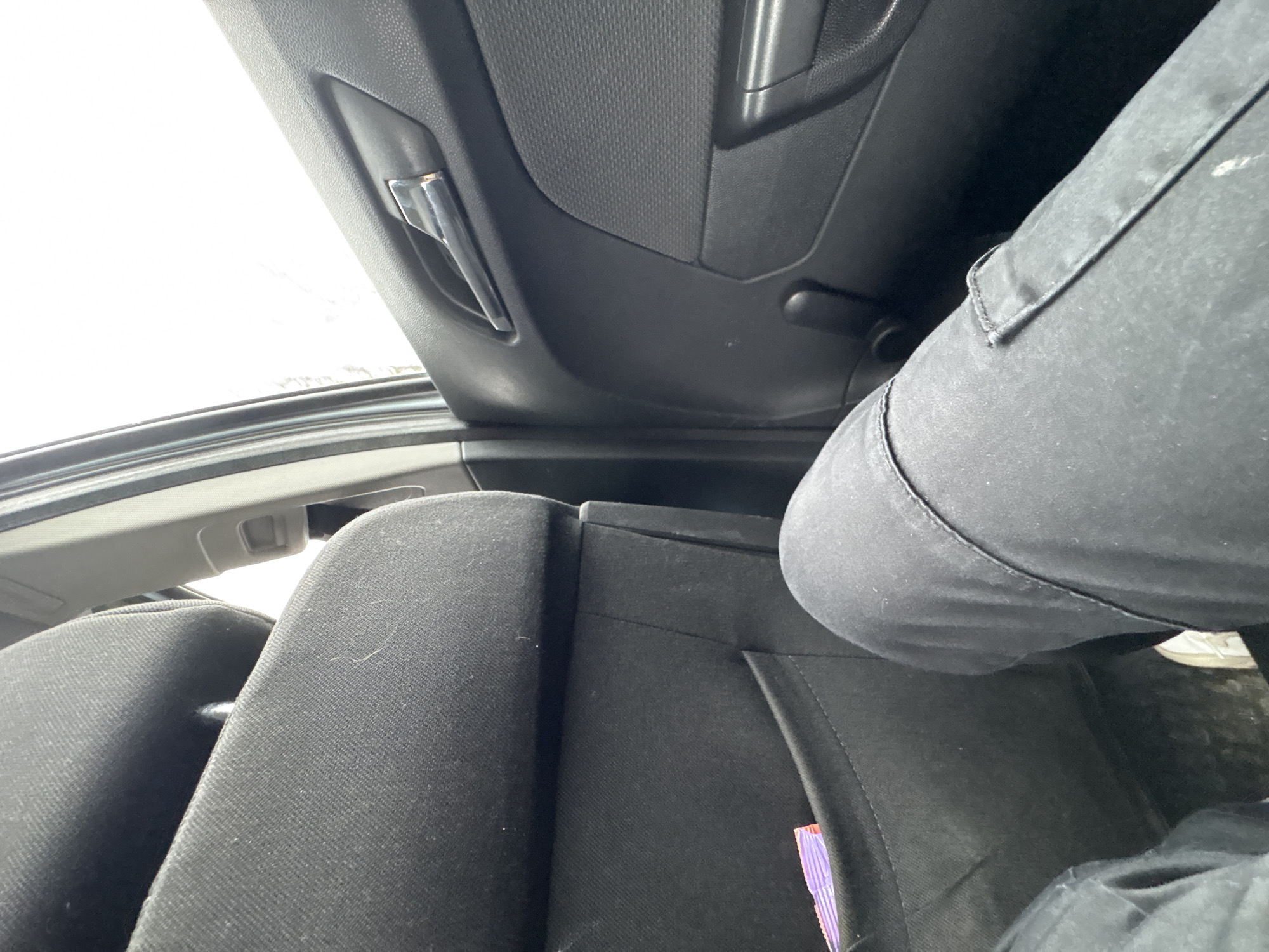 n interior view of a car, focusing on the rear passenger seat and the overhead area. The seat is black fabric, with a small glimpse of a purple object tucked into the seat. The interior ceiling is black plastic, with a handle visible. The leg of a person wearing black pants is visible in the upper right of the frame. Outside the car window, there's a blurred view of what appears to be a snowy or bright outdoor environment. There is no indication from the image that it is in Stozher, Bulgaria.