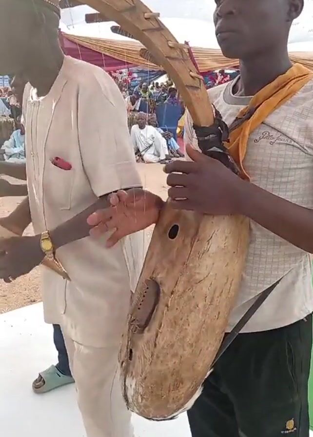 two men performing music outdoors. The man on the left is wearing a white outfit with a small hat, a watch, and green sandals. He is holding a thin, rectangular object and appears to be singing into a microphone. The man on the right is wearing a light gray t-shirt with black pants and a yellow strap across his chest. He is playing a large, wooden stringed instrument. The instrument has a gourd-shaped body and a curved neck with pegs. The background shows a crowd of people seated under a canopy decorated with white and pink flowers. The ground is covered in sand.
