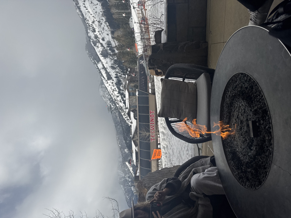 A landscape features snow-capped mountains beneath a cloudy sky, viewed from a patio area. An outdoor fire pit burns in the foreground, next to a wicker chair with a gray cushion. A person wearing a hat and wrapped in a blanket is visible in the lower foreground, appearing to be holding a phone. In the background, there is a building with the word "TEEWINOT" displayed and an orange sign reading "FAMILY ZONE."