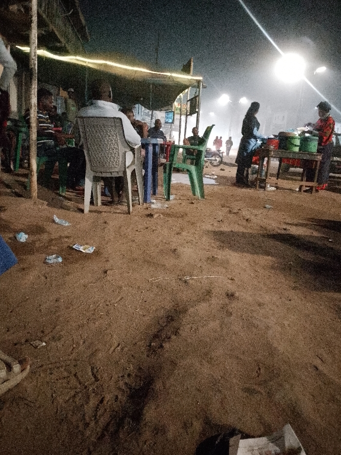 An outdoor evening scene shows people gathered under a makeshift shelter. Tables and chairs are scattered on the sandy ground, with litter visible. Some individuals are seated, while others appear to be at a food stand. The ambiance suggests a casual gathering, likely centered around a food vendor. Streetlights illuminate the scene with a hazy glow. A motorcycle can be seen on the background. The overall atmosphere is lively, communal, and relaxed.