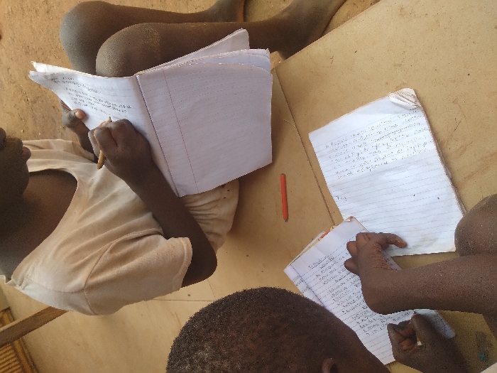 Two individuals, possibly children, are depicted engaged in a writing activity on a light-brown, flat surface in an outdoor or semi-outdoor setting within the city of Godogodo, Nigeria