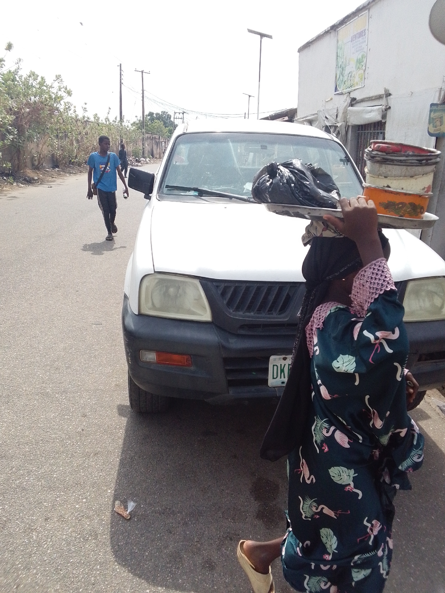 The image captures an outdoor street scene in Unknown, Unknown, under bright daylight. In the foreground, a person with dark skin, wearing a dark green garment patterned with pink flamingos and light green leaves, a black head covering, and light-colored sandals, walks away from the camera. This individual carries a rectangular silver tray on their head, supported by their right hand; the tray contains a black plastic bag and a stack of three multi-colored round containers (red, white, orange). A white pickup truck or SUV is parked facing slightly left in the midground, displaying a black plastic bag on its windshield and a partial license plate starting 'DKL' visible below the grille. Its front bumper is dark gray or black and features an orange indicator light. To the left of the vehicle, a young adult male with dark skin, wearing a blue t-shirt, dark trousers, and dark sandals, walks towards the camera on the asphalt road, holding a white object in his right hand. A third, indistinct person is visible walking further down the road in the background. The environment features an asphalt road surface with scattered debris, including a wrapper near the front bumper of the white vehicle. On the right, a light-colored building with a large "VENTURES" banner is visible, with a section below the banner appearing covered with white material. On the left, a low wall runs alongside the road, behind which are overgrown green bushes and small trees. Two wooden utility poles with power lines and a solar-powered street light are present in the background against a bright, clear sky.