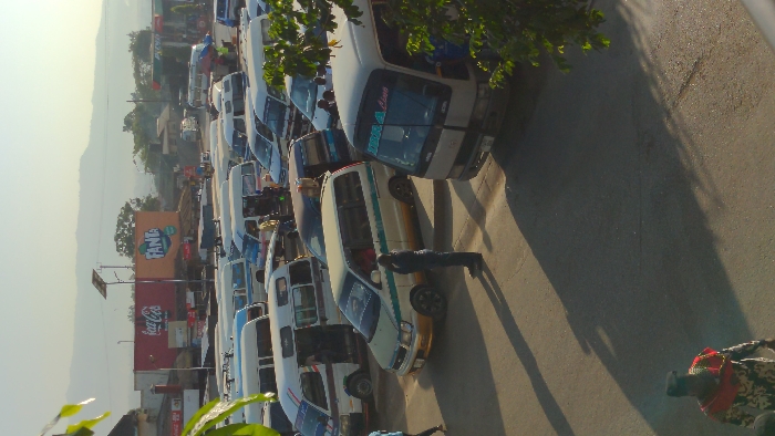 Many white vans are parked next to each other on a road with a person standing between them. The vans are of different shapes and sizes, and most have blue and green markings. There is a road and hill visible in the background as well as a Fanta and Coca-Cola advert.
