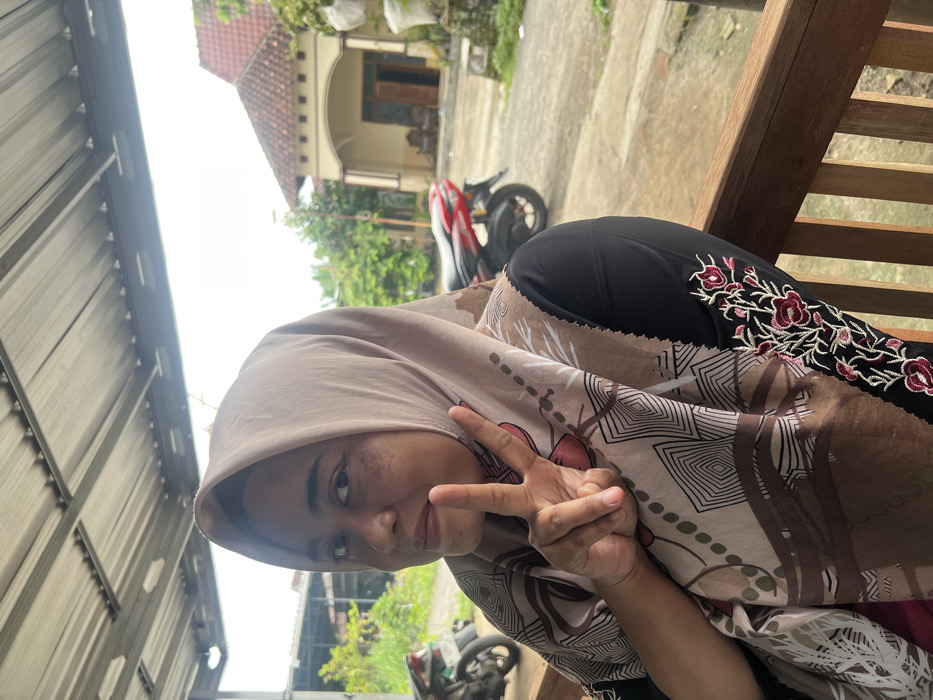 A person wearing a tan hijab is posing, extending their hand with two fingers up in a peace sign. They are sitting, with a black garment adorned with red floral embroidery visible. The background includes a house with a red roof, a motorcycle, and green vegetation. The scene appears to be outdoors, possibly on a porch or patio, with a metal roof structure on the left side. The photo is taken at an angle.