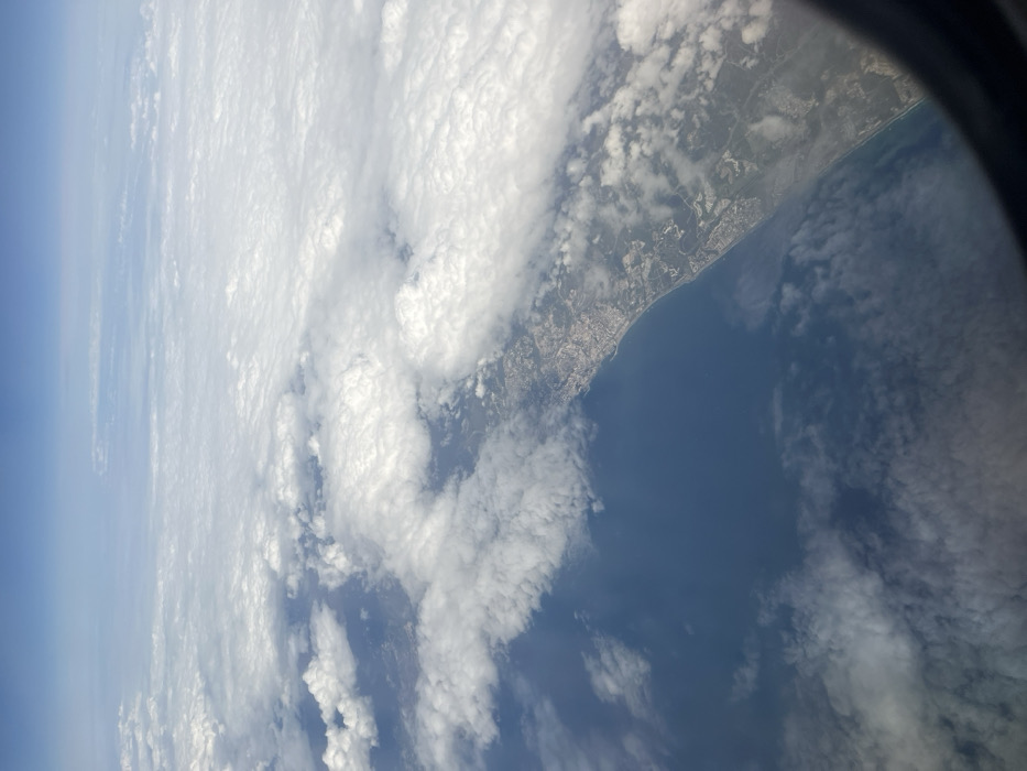 An aerial photograph, captured from an aircraft window, presents a high-altitude view of a coastal region under a partly cloudy sky