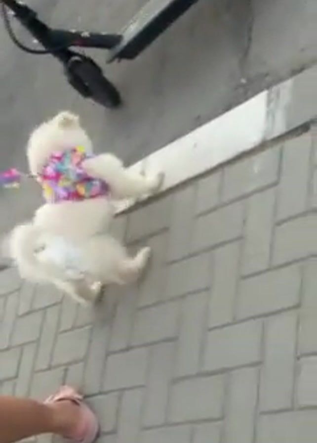 A person in pink sandals walks on a brick sidewalk, pulling a small white dog on a purple leash. The dog wears a colorful harness. An electric scooter is parked nearby. The video is shaky and close to the ground.