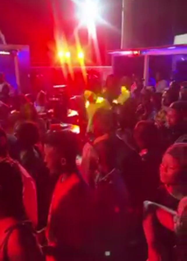 large crowd of people dancing at an outdoor party. The scene is lit with bright red and white lights, as well as blue neon accents on a nearby structure. People are dressed in a variety of styles, and many are moving to the music. The atmosphere appears lively and energetic.