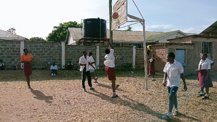 A group of students are playing basketball on a dirt court. One student is attempting to shoot the ball into the hoop. Other students are standing around watching or participating. Buildings and a water tank are visible in the background. The weather appears sunny and bright. Some students are wearing what look to be maroon skirts or shorts with white shirts. One person wears a different colored shirt. A brick wall is visible on the left of the image.