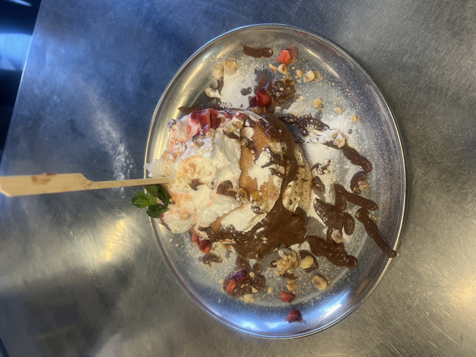 The scene depicts a dessert dish presented on a metallic plate, positioned on a reflective metallic surface. The primary subject is a stack of three round, golden-brown pancakes or similar pastries, heavily adorned with various toppings. A substantial dollop of white whipped cream covers the top pancake, featuring a small green mint sprig embedded within it. A light-colored, flat bamboo skewer is inserted vertically into the center of the pancake stack. A thick, dark brown substance, consistent with chocolate spread, is generously applied over and between the pancakes, also dripping onto the plate. Fine white powdered sugar is dusted across the entire dish and the surrounding areas of the plate. Scattered elements include chopped, light brown nuts, identified as hazelnuts, and small, diced red fruit pieces, consistent with strawberries, dispersed over the dessert and the plate surface. A reddish liquid or syrup is visible drizzled over the whipped cream. The dessert rests on a circular, unpolished metallic plate, exhibiting minor surface scratches and food residue. This plate is situated on a smooth, reflective gray metallic surface, likely a countertop. The immediate background is dark and out of focus, providing no discernible details. The location of this scene is Sofia, Bulgaria.