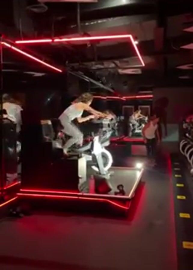 woman in a workout outfit with her hair down standing on an exercise bike, pumping her arms and legs as if pedaling, while the bike stays stationary. The exercise bike is on a small platform outlined by red neon lights, and the gym itself has red neon accents and mirrored walls. Other people are also in the gym, some standing around and some on bikes. The gym environment appears dark, with minimal lighting except for the red neon and some ceiling lights.