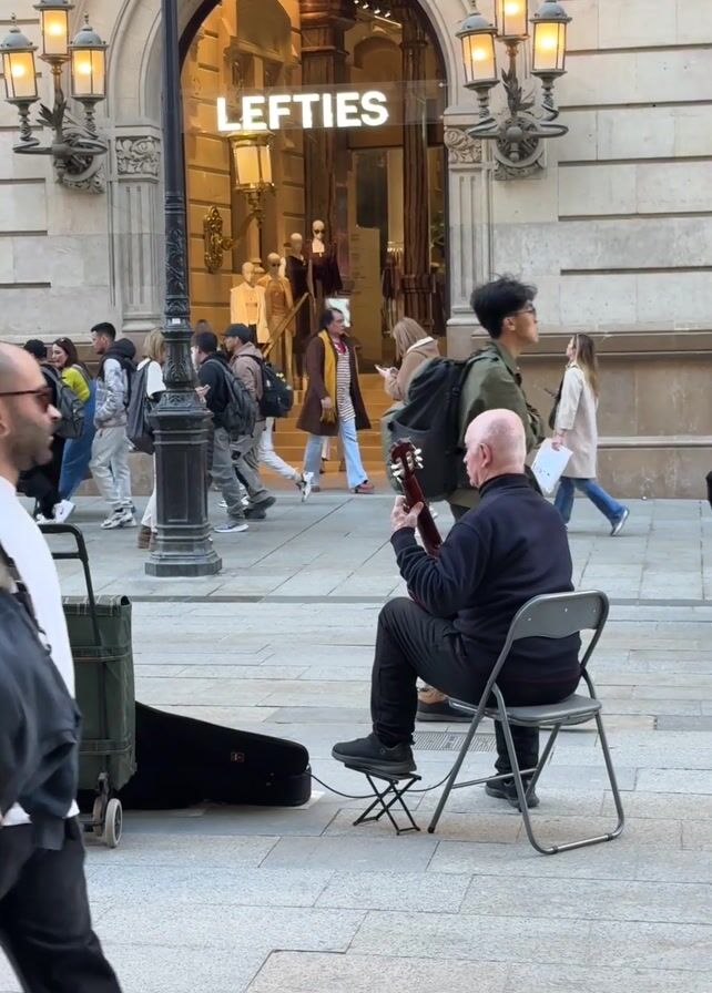man playing a guitar on a city street. The man is sitting on a folding chair. He is bald with gray hair around the sides and wearing a dark jacket and pants. A black guitar case is on the ground next to him. To his left is a green shopping cart. Behind him is a store labeled “LEFTIES”. Pedestrians walk by in both directions, largely paying the musician no mind. A black lamp post stands next to him. The pavement is made of large, rectangular gray stones. The video is taken during the day in a city location.