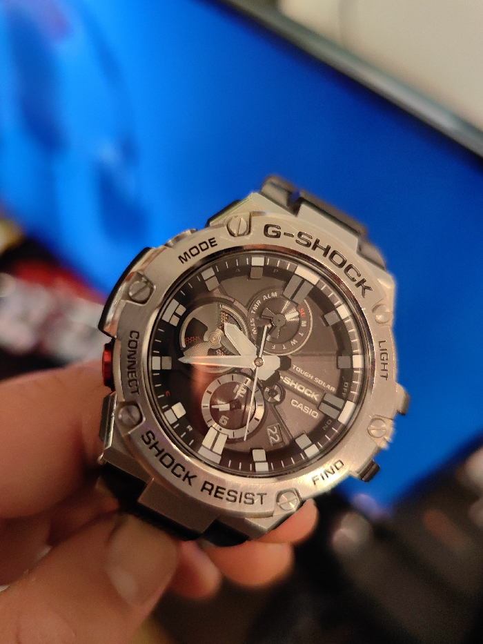 - "A light-skinned human hand, with fingers partially visible on the lower left, holds a silver-cased Casio G-Shock wristwatch" by FM-AyYj03, licensed under CC BY 4.0