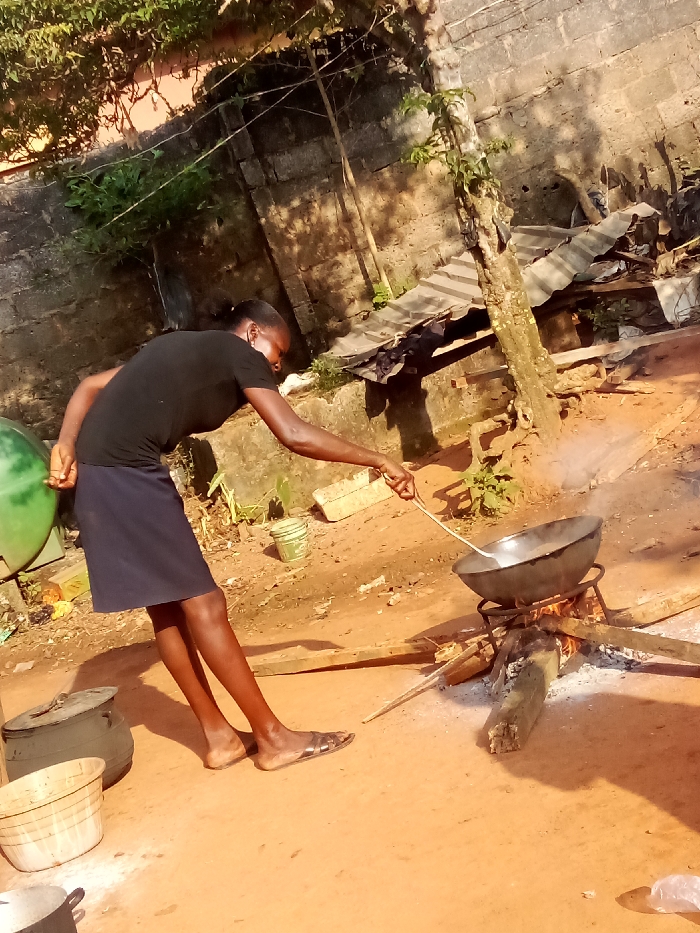 A woman in a black shirt and blue skirt stirs a large pot over an open fire. The pot is sitting on a metal stand above burning wood. The scene is set outdoors with a weathered wall and overgrown vegetation in the background. There are other pots and containers nearby. The ground is dirt, and the woman is wearing one sandal. Smoke rises from the pot.