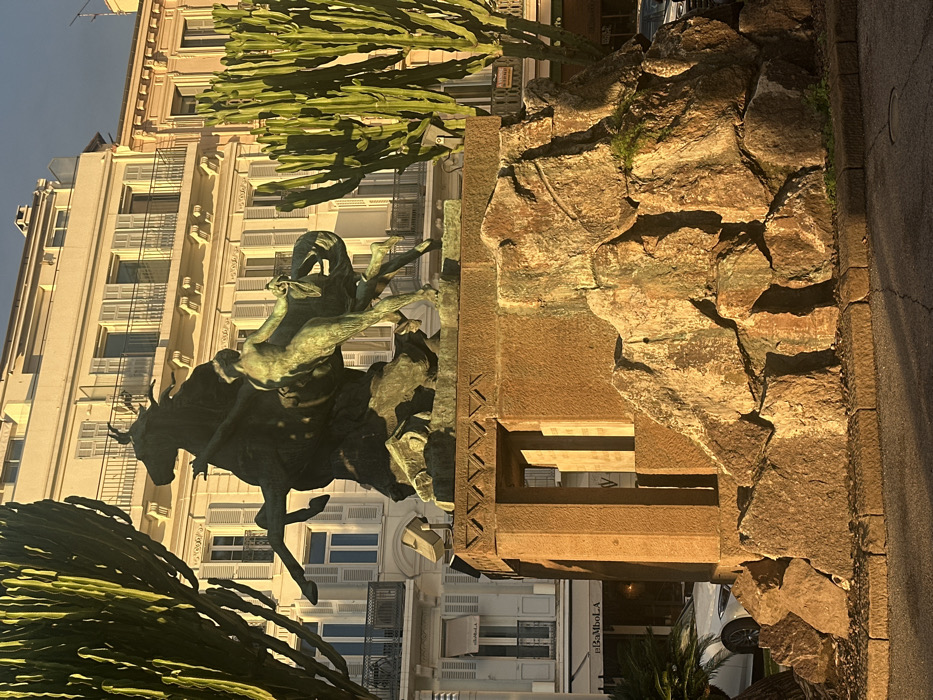 A bronze sculpture by Antoine Bourdelle, known as "Le Taureau" (The Bull), is centrally depicted on the Esplanade Georges Pompidou in Cannes, France