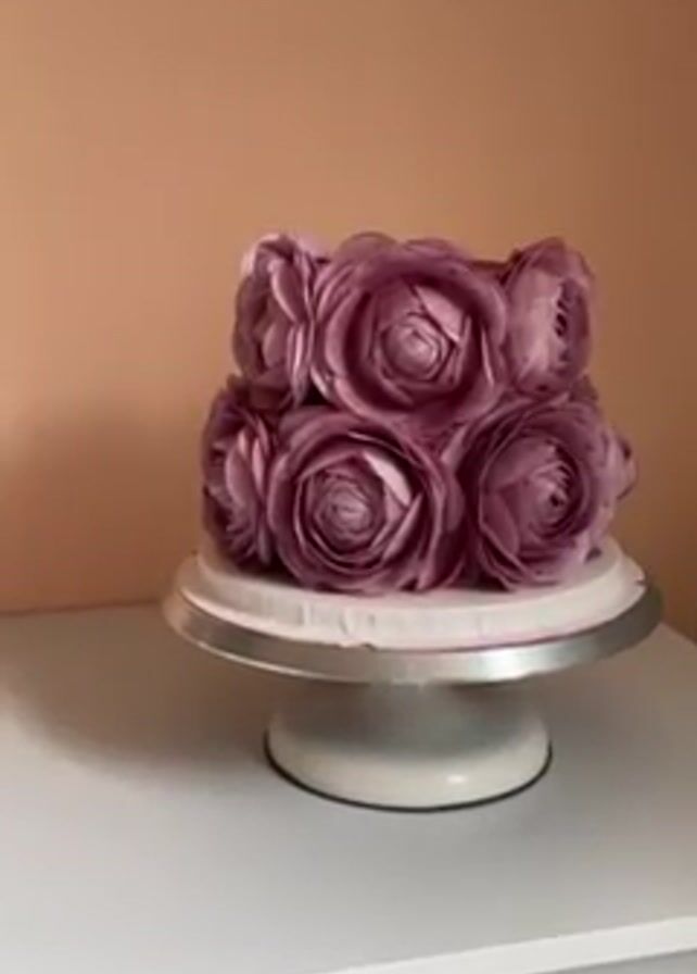 A close-up shot of a cake on a white cake stand against a pale orange wall. The cake is adorned with large, stylized flowers that appear to be made of a translucent material, possibly paper or fabric. The flowers are a muted, dusty rose color. A hand with fingers spread wide enters the frame. The palm and fingers are stained a similar shade of rose color, indicating the person may have been involved in making the cake or coloring the flowers. The background is out of focus. The words “Art” and “artist” are spoken.
