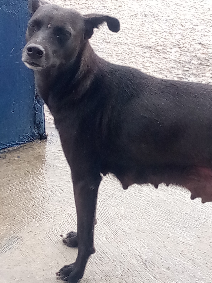A black adult female dog, exhibiting short, dark fur with scattered light specks, stands on a damp, textured concrete surface. The dog's head is turned towards the viewer, with its eyes appearing partially closed or squinting. Prominent, pendulous teats, some dark pink, are visible along its abdomen, indicative of recent lactation. To the left and slightly behind the dog, a vertical structure, painted in a faded, chipped blue, is present, showing moisture at its base. The ground surface reflects light due to dampness. The scene is located in El Dátil, Venezuela.