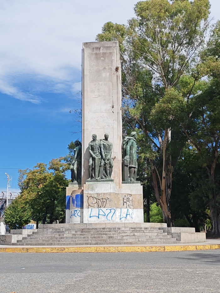 The scene depicts the Monument to the Heroes of Malvinas in Plaza Malvinas, La Plata, Argentina