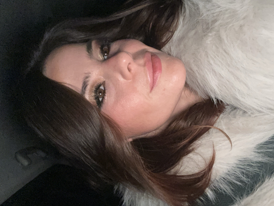 A woman poses in a selfie, her head tilted towards the right. She has brown hair and light skin. She is wearing makeup. She is wearing a white fur coat. The background is dark.
