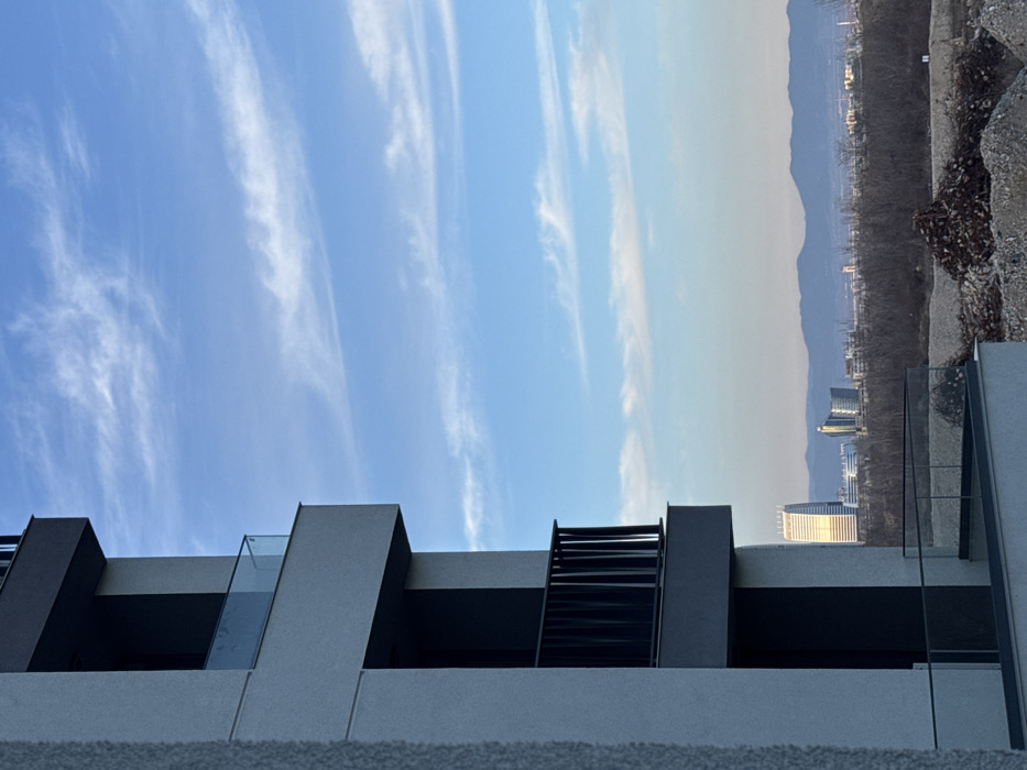 The image displays a panoramic view from a multi-story residential building in Sofia, Bulgaria, looking southeast towards the Vitosha mountain range. In the immediate foreground, to the left, is the exterior of a modern, newly constructed building, rendered in a light gray textured finish. Visible are sections of at least three balconies: an upper balcony with a clear glass balustrade and a dark top rail, a middle balcony featuring a dark, vertical slat metal railing, and a lower, partially visible balcony also equipped with a glass balustrade. Dark gray accent panels are present on the undersides of the balconies and within recessed facade sections. No individuals are present on the balconies or within the visible portions of the building. The midground reveals an undeveloped or recently cleared plot of land, characterized by piles of earth, gravel, and construction debris, including twisted metal or rebar. Sparse, leafless vegetation is scattered across this area. The background presents the distinctive skyline of Sofia. Prominently visible on the left side of the cityscape is the **Capital Fort** skyscraper, a tall, slender building with a curved, light-colored facade, its upper sections reflecting sunlight. To the right of Capital Fort, a cluster of modern commercial buildings, characterized by their glass and golden-hued facades, are identifiable as part of **Business Park Sofia**. Forming the distant horizon is the silhouette of **Vitosha Mountain**. The sky above is clear and blue, sparsely dotted with thin, white cirrus clouds, indicating fair weather. The angle of sunlight on the buildings suggests either early morning or late afternoon. The vantage point is consistent with a residential area in the **Mladost district** of Sofia, a rapidly developing area located northwest of Capital Fort and Business Park Sofia.