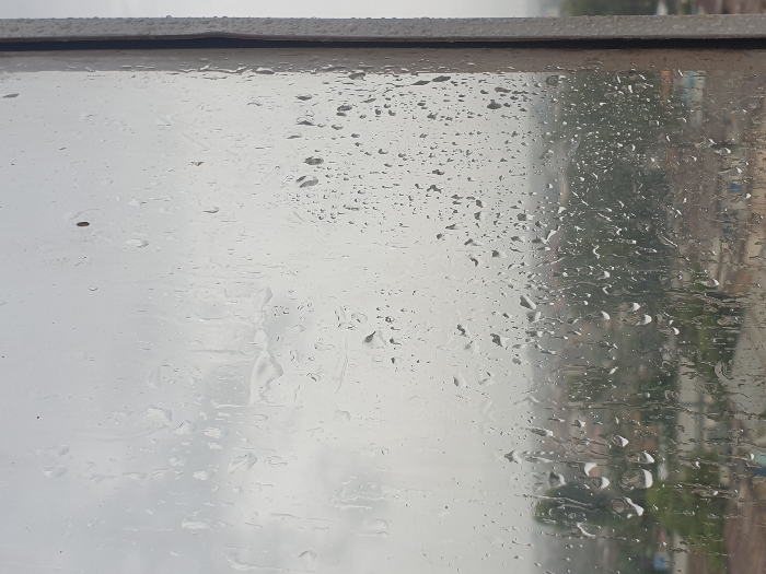 The image displays an elevated view of the city of Machakos, Kenya, observed through a rain-streaked window. The foreground is dominated by a clear glass pane densely covered with numerous water droplets, vertical rivulets, and larger coalesced water formations, indicating precipitation. A dark gray or black vertical window frame runs along the entire right edge of the image. Through the blurred and wet glass, an out-of-focus urban landscape is visible under an overcast, light gray sky. Distant, indistinct buildings, scattered patches of green vegetation, and areas of light-colored ground are discernible in the middle and lower background. No people or specific actions are visible within the scene. Two small, dark particulate specks are present on the upper portion of the window pane.