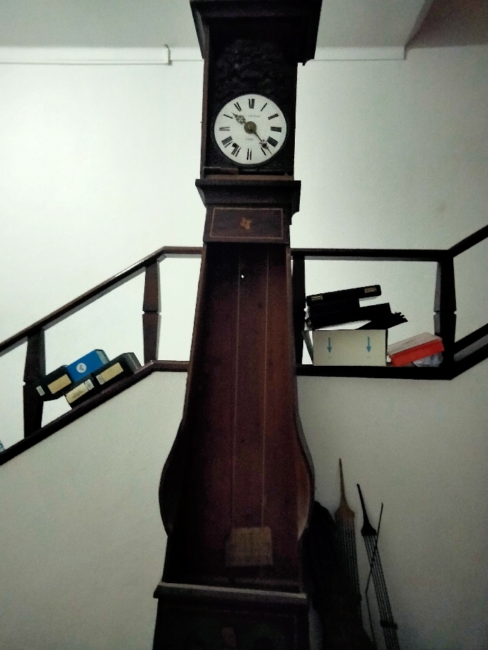- "A tall grandfather clock stands against a white wall, positioned near a staircase with black railings" by FM-wrPJ12, licensed under CC BY 4.0