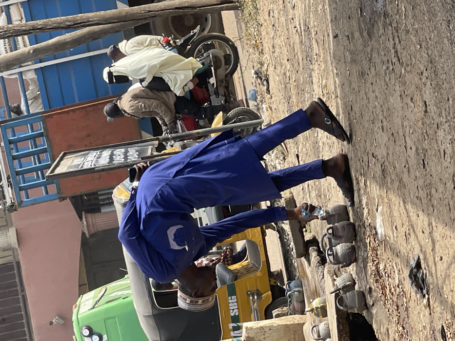 - "An outdoor scene in Zaria, Nigeria, depicts a man in a royal blue traditional garment and cap, bending forward to interact with a line of small, grey, pottery-like containers on the unpaved ground" by FM-vijg43, licensed under CC BY 4.0