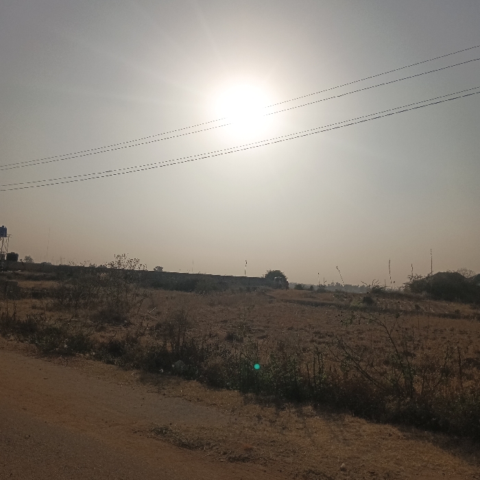A landscape under a bright sun features an arid field. Dry, brown grass and sparse vegetation cover the foreground and middle ground. A low wall stretches horizontally in the distance, with a few small trees scattered beyond. Overhead, power lines intersect the sky, adding a linear element to the scene. A water tower is visible to the left. The scene is bathed in hazy sunlight.