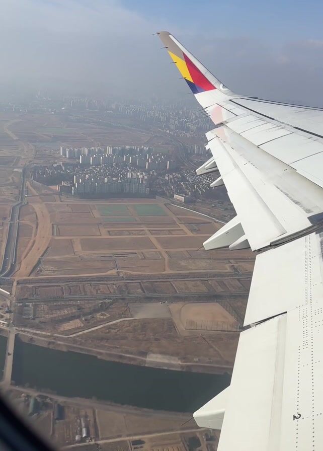 view from an airplane window, displaying the wing of the plane with the Asiana Airlines logo, along with a landscape below