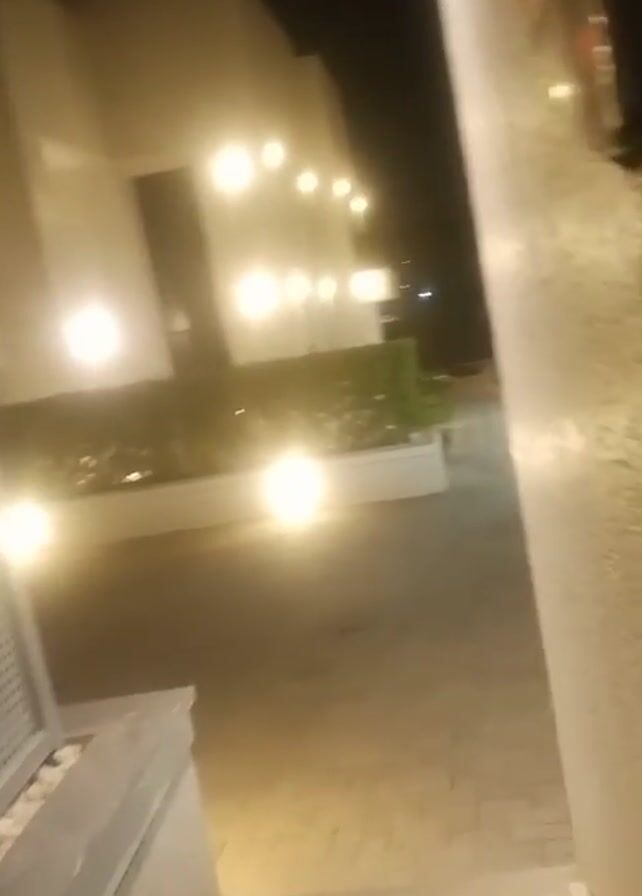 n exterior scene at night. A modern, possibly commercial building with a white facade is visible, illuminated by several round, bright, warm-toned lights. There is greenery in the foreground, likely planted in raised beds. The ground is paved with what appears to be rectangular stones. A white, perforated metal panel structure sits to the left of the frame, above a base filled with white stones. The camera perspective is low and slightly tilted upwards, suggesting it's being held close to the ground. The camera pans slowly. There are no people clearly visible, although a blurry shape is discernible in the reflection on a wall. The overall ambiance is calm.