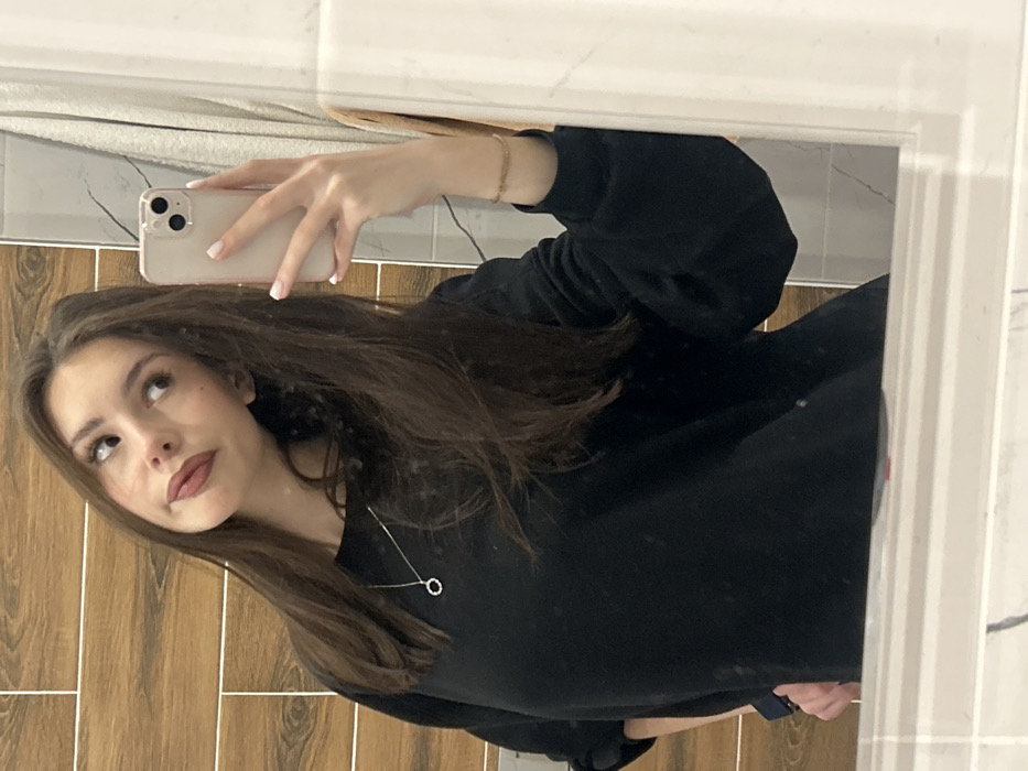 The scene is located in an indoor setting, consistent with a private residence bathroom in Novosergievka, Russia. A young adult female is depicted in a mirror selfie, facing forward with her head slightly tilted to her right. She has long, dark brown hair, dark eye makeup, and matte lipstick, exhibiting a slight pout with her gaze directed upwards and to her left (viewer's left). She is wearing a black long-sleeved, crew-neck top. A silver-colored chain necklace with a small, open circular pendant rests on her chest. A thin, possibly gold-toned, bracelet is visible on her right wrist. Her right hand, with light-colored manicured fingernails, holds a light-colored smartphone (appearing to be an iPhone 13 or 14 series due to the dual diagonal camera lenses and case) in front of her midsection, capturing the reflection. A dark-colored wrist-worn device is partially visible on her left wrist, behind her back. The background consists of tiled walls. Behind the subject's left shoulder, a wall features horizontally oriented rectangular tiles with a brown wood-grain pattern. To her right, a different wall section is covered with lighter-colored tiles, possibly white or light grey, exhibiting dark, linear vein patterns consistent with marble. A light-colored towel is draped over a fixture on this wall. The lower portion of the image shows a white countertop or ledge with a marble-patterned trim. The lighting is even, suggesting an artificially lit interior space.