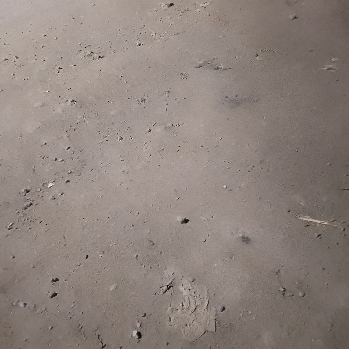 A gray, dusty surface dominates the view. Sparse debris, small stones, and a twig are scattered across it. A distinct footprint impression is visible in the lower part of the image. The overall texture suggests a coarse or sandy material, possibly soil or concrete. Subtle variations in shading and brightness indicate unevenness. The lighting is somewhat muted, creating a soft, diffused atmosphere.
