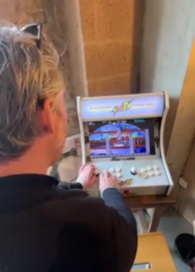 A man is playing an arcade game. He has graying hair, fair skin, and is wearing a black sweater. A pair of sunglasses are perched on his head. His hands are on the controls, actively playing the game. The arcade machine is white with a screen displaying a colorful, pixelated game. Above the screen, it reads "Arcade Edition." The machine is resting on a wooden stand. The environment appears to be a room with unfinished brick walls and a wooden floor. The scene is well lit with daylight.