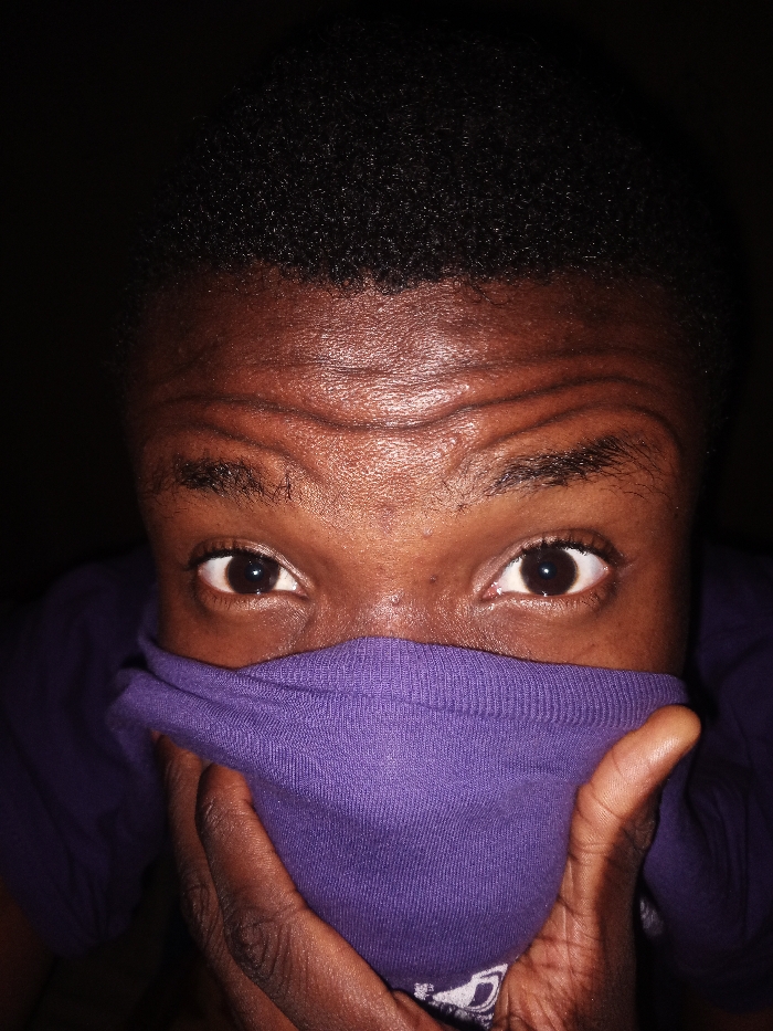 A person with dark skin and short, dark hair stares intently at the camera. Their forehead shows slight wrinkles. A purple garment covers the lower half of their face, held in place by a hand. The background is dark, drawing focus to the eyes and upper face. The lighting suggests a close-up, personal perspective.