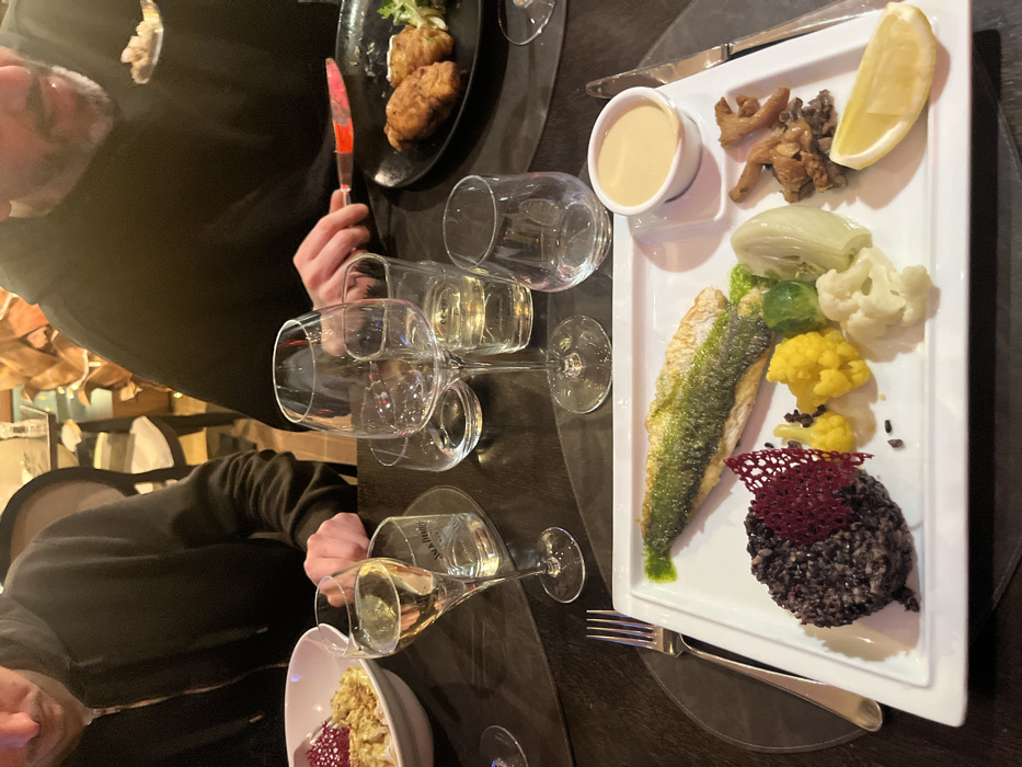 A white platter holds a culinary creation: grilled fish with vibrant green skin, black rice adorned with a purple edible net, cauliflower florets (white and yellow), sliced fennel, mushrooms, a wedge of lemon, and a small bowl of sauce. Wine glasses dot the table, some filled with a light-colored beverage. A dark-colored plate holds fried food, and a partially visible person holds a knife. A bowl with food is visible on the left edge.