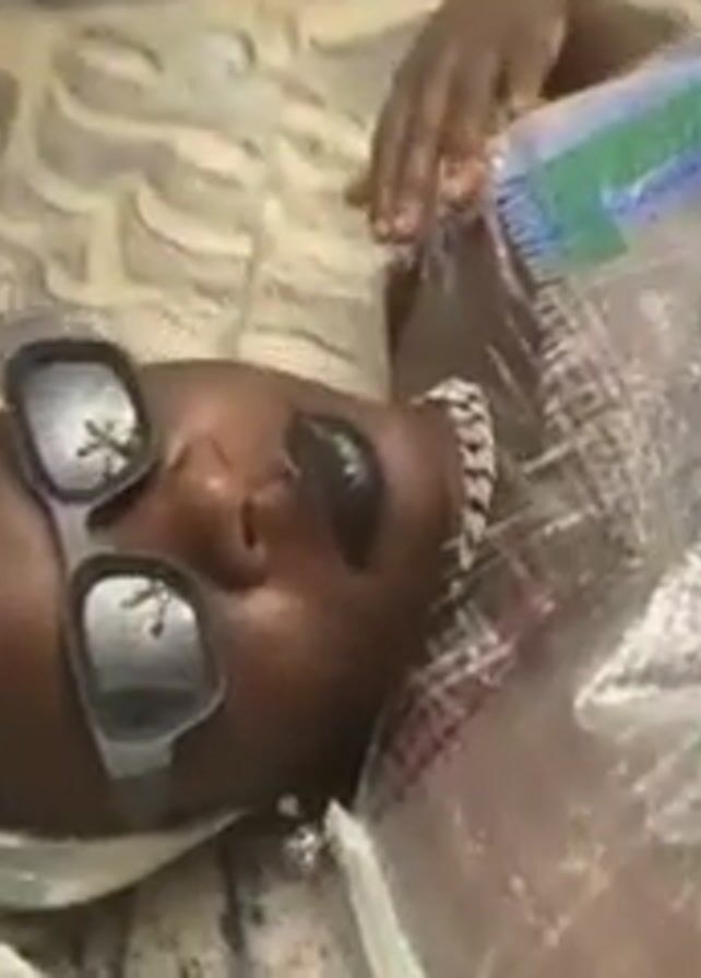 A close-up, overhead shot shows a person lying on the floor covered in plastic and some kind of silver material. The person is wearing large sunglasses, a diamond necklace, and appears to be wearing makeup. The floor is covered in what looks like marbled tile.