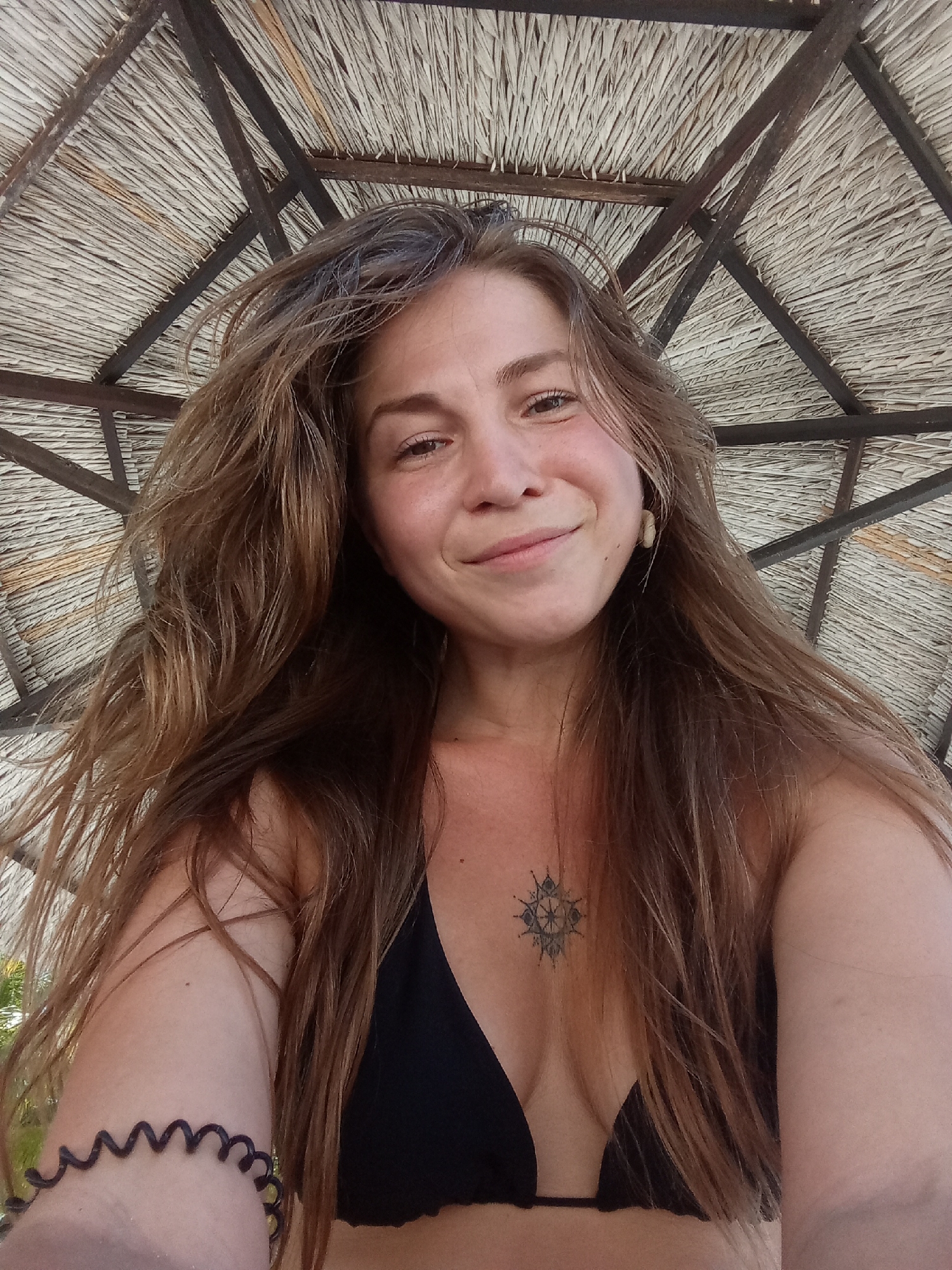 A fair-skinned woman with long, light brown hair is seen from a low angle, smiling at the camera. She is wearing a black bikini top and has a tattoo on her chest. She has a dark, coiled bracelet on her left arm. Above her is a thatched roof structure, possibly a beach umbrella or palapa. The location is likely a beach in the Bac Natural Heritage Area Trang, Vietnam, based on the context. The light is bright, suggesting a sunny day.