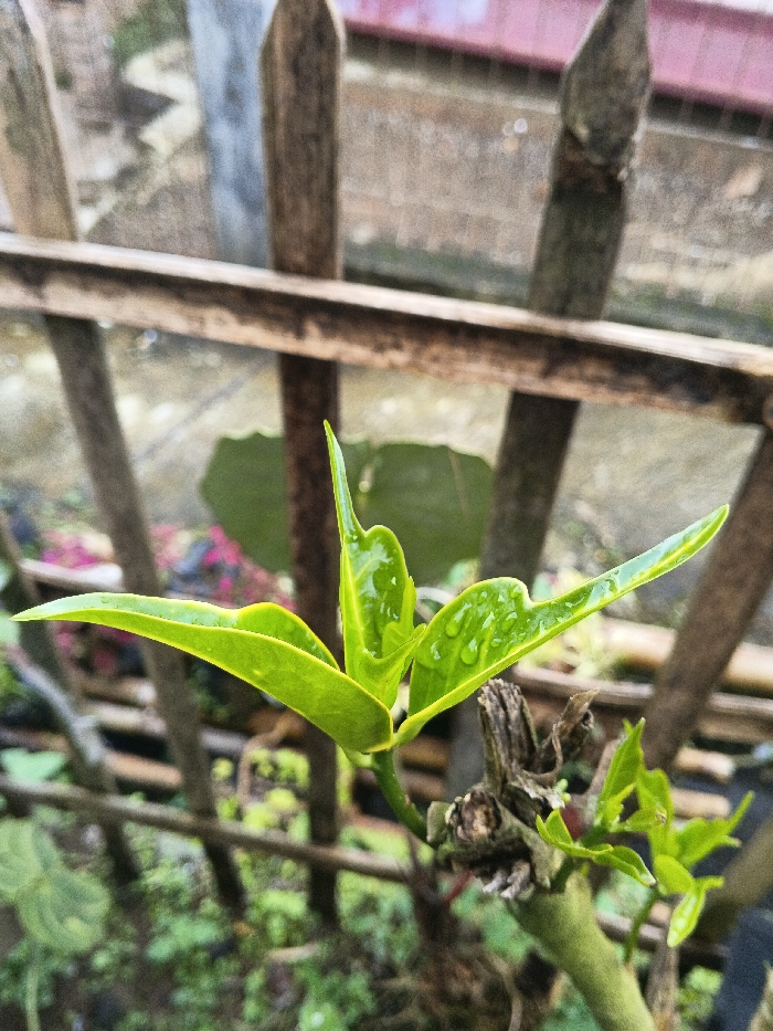 The image depicts a close-up, ground-level view of a vibrant green plant shoot emerging from a thicker, gnarled brown woody stem. The central shoot features multiple freshly unfurled leaves, the largest of which are a bright lime green and display numerous small, clear water droplets on their surfaces, indicating recent moisture. Smaller, lighter green leaves are visible further down the stem. In the blurred background, a rustic wooden fence or trellis is visible, constructed from vertical stakes and at least one horizontal cross-member made of light brown wood. Beyond the fence, there are indistinct areas of green foliage and a blurry hint of red or pink coloration, possibly from other plants or structures. The immediate ground level surrounding the plant appears to be covered in sparse green vegetation or moss. No people or animals are present. The scene is illuminated by natural light. The location is specified as Unknown, Uruguay.