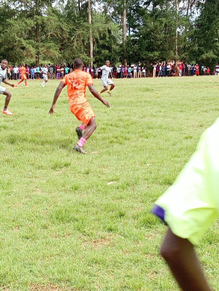 The image displays an outdoor soccer match in progress on a grassy field in Ngenyilel ward, Kenya