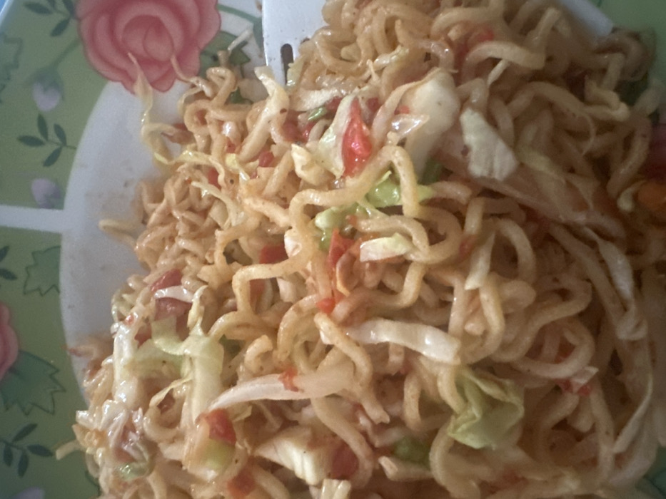 - "A plate is filled with cooked instant noodles, interspersed with shreds of pale green cabbage and bits of red tomato" by FM-So1mU2, licensed under CC BY 4.0