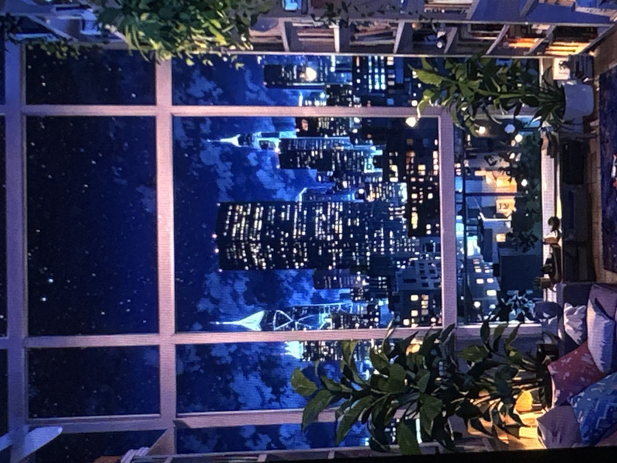 The image depicts an interior view of a room looking out through a large, multi-pane window at a city skyline at night