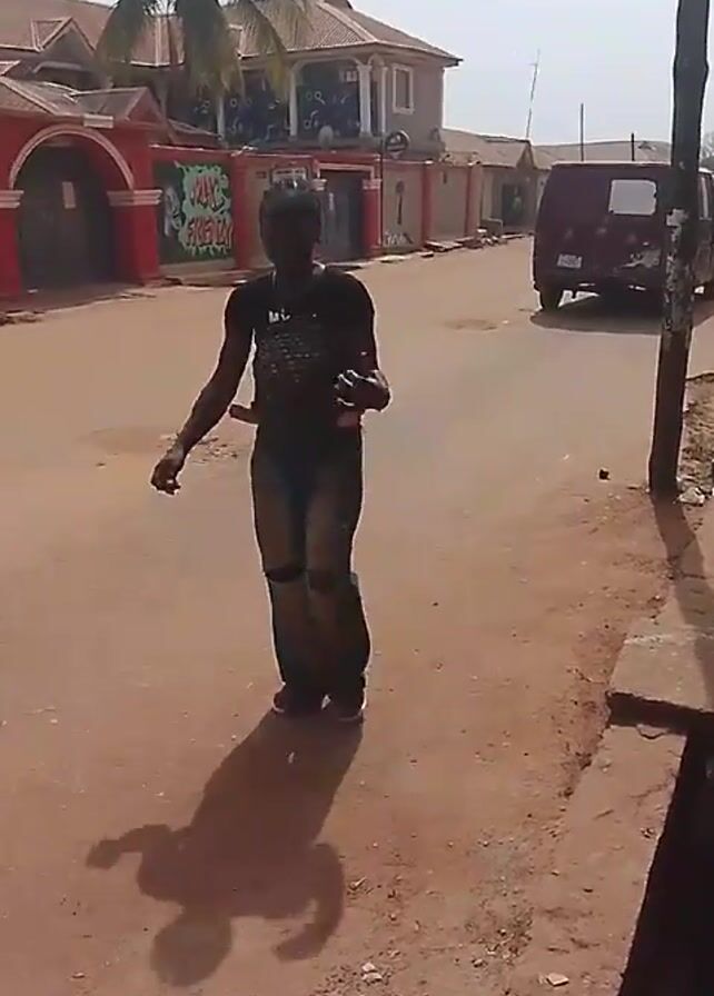 person standing on a dirt road in a neighborhood. The person is wearing a black t-shirt, blue jeans, and sneakers. The person is holding something in their hands and looking at it closely. The background includes a house with a red gate, a palm tree, a dark-colored van, and a ditch on the side of the road. The day appears sunny and bright.