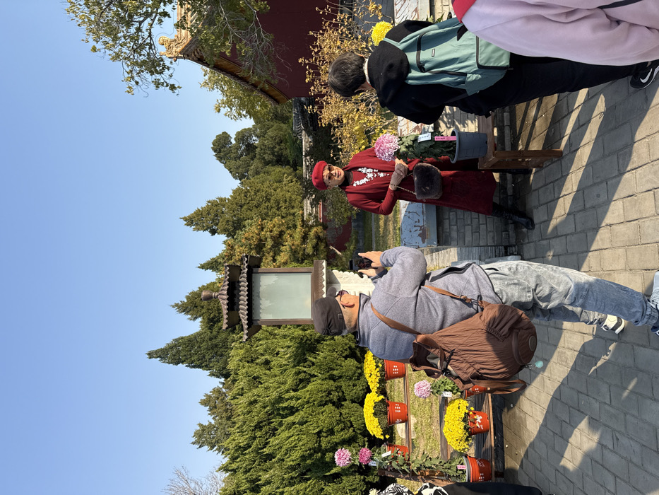The image depicts an outdoor scene within Xicheng District, China, under a clear blue sky. In the foreground, a male subject, viewed from the back, is wearing a black baseball cap, grey long-sleeved top, light-wash jeans, and a brown quilted backpack. He holds a black smartphone horizontally, actively photographing a female subject positioned center-right. This female subject is attired in a red beret, a long red coat or dress, a white statement necklace, sunglasses, and black boots, holding a small dark fur-textured purse. She stands next to a potted pink chrysanthemum placed on a small wooden stool. To the right of the primary subject, another individual, seen from behind, wears a black hoodie and a teal-colored backpack. The mid-ground features a decorative traditional Chinese-style lantern on a stone pedestal. A dense backdrop of various green trees, primarily conifers, fills the background, with a red building exhibiting traditional Chinese roof architecture visible on the far right. Multiple potted yellow and pink chrysanthemums are arranged on low wooden stands along a paved walkway composed of rectangular grey bricks.