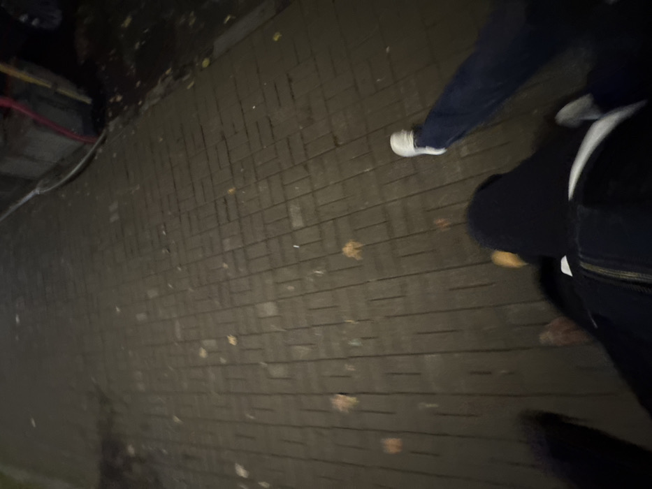 The image displays a low-light, street-level view of a paved pedestrian area at night in Yerevan, Armenia. The ground is covered in dark grey rectangular pavers laid in a herringbone pattern, with scattered brown and orange fallen leaves visible. Motion blur indicates movement. Two individuals are partially visible from the waist down. In the foreground-center, an individual wears dark trousers and a dark jacket with a visible zipper and white lining. A light-colored shoe (possibly tan or yellow) is partially visible on the left foot, with another dark shoe hinted at further left. To the mid-ground-right, a second individual wears dark blue jeans and a white sneaker on their visible right foot. Along the far right edge of the pavement, a dark, damp strip of ground leads to an indistinct, darker area with a blurry structure or object. Vague red and yellow linear elements, possibly pipes or cables, are discernible within this darker area, suggesting industrial or commercial infrastructure adjacent to the sidewalk.