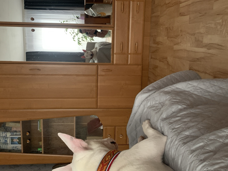 The image depicts an interior residential scene in Chaikovsky, Russia. In the foreground, a white Bull Terrier, wearing a red, white, and yellow patterned collar, is visible from behind and the side, lying with its front paws on a light grey quilted duvet covering a bed. Directly opposite, a large, light-colored wooden wardrobe or cabinet system occupies the midground. The left segment of this unit features a glass-fronted display cabinet with shelves containing a framed photograph of a man in uniform and other assorted items, with two drawers positioned below. The central part consists of a solid wooden cabinet with two doors. The right portion of the furniture is composed of multiple mirrored panels. These mirrors reflect the frontal view of the same white Bull Terrier, sitting upright on the bed, and an individual holding a black smartphone, actively capturing the photograph. The reflection further reveals a window with light sheer and dark side curtains, a green potted plant, and a white bag, possibly containing dog food, located on the floor or a low surface. The flooring throughout the visible area is light-colored laminate or wood.